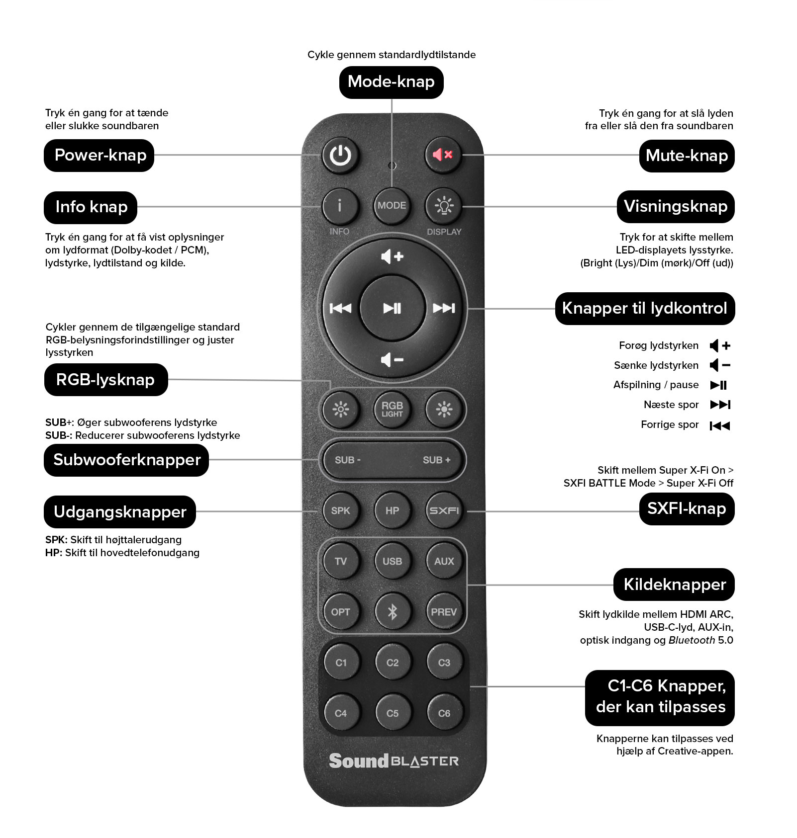 Sound Blaster Katana V2 leveres med en omfattende fjernbetjening, som giver dig adgang til alle de indstillinger, du har brug for. Ud over de grundlæggende lydkontroller kan du også ændre lydkilde, skifte RGB-belysningsforindstillinger eller få adgang til en brugerdefineret funktion, der er gemt på en af de seks brugerdefinerbare knapper!