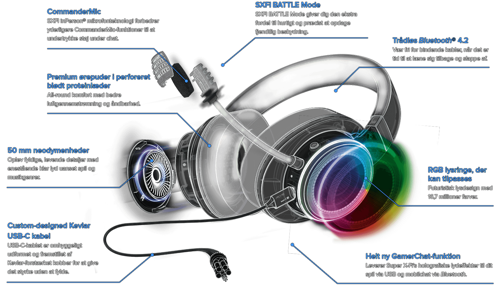 Oplev fyldige og levende lyddetaljer med enestående klarhed uanset musik-, film- eller spilgenrer. Med de indbyggede 50 mm neodymenheder kan SXFI AIR GAMER levere kraftfuld, biograflignende bas og få en komplet og medrivende spiloplevelse samt musiknydelse.